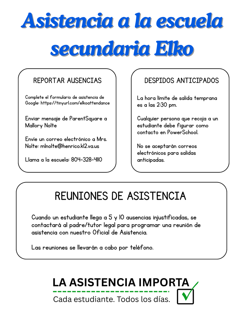 SCHOOL OPERATIONS ATTENDANCE UPDATES | If your student is absent, their absence needs to be reported within 48 hours. Absences can be reported by: Filling out the Elko Attendance Google Doc Emailing Mrs. Nolte: mlnolte@henrico.k12.va.us Sending a Parent Square message to Mrs. Nolte Sending a handwritten note to your student when they return to school Calling the school: 804-328-4110 ID Badges Please ensure that your students are wearing their ID badges every day. Students now need to scan their ID badges when they arrive late to school and when they have an early dismissal. Transportation/Bus Information If your student’s bus is running late in the morning, please call the Transportation Office at 804-261-9401. You can also download the Parent Portal Bus App to track the bus: https://www.henricoschools.us/page/parent-portal-bus-app Contacts/Pick-up Lists: Please make sure your student’s pick-up list is up to date by updating the Contacts listed in PowerSchool. You can do this by logging in to your Parent Portal account. Anyone coming to pick up a student for early dismissal MUST be listed in PowerSchool. If someone is not listed in PowerSchool, we will not be able to call the student down. EARLY DISMISSAL: The cutoff time for early dismissals is 2:30 pm. REMINDER: |
